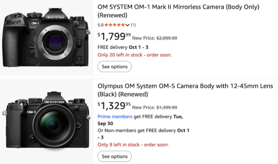 Renewed (refurbished) OM System cameras for sale on Amazon (OM-1 II, OM-5)